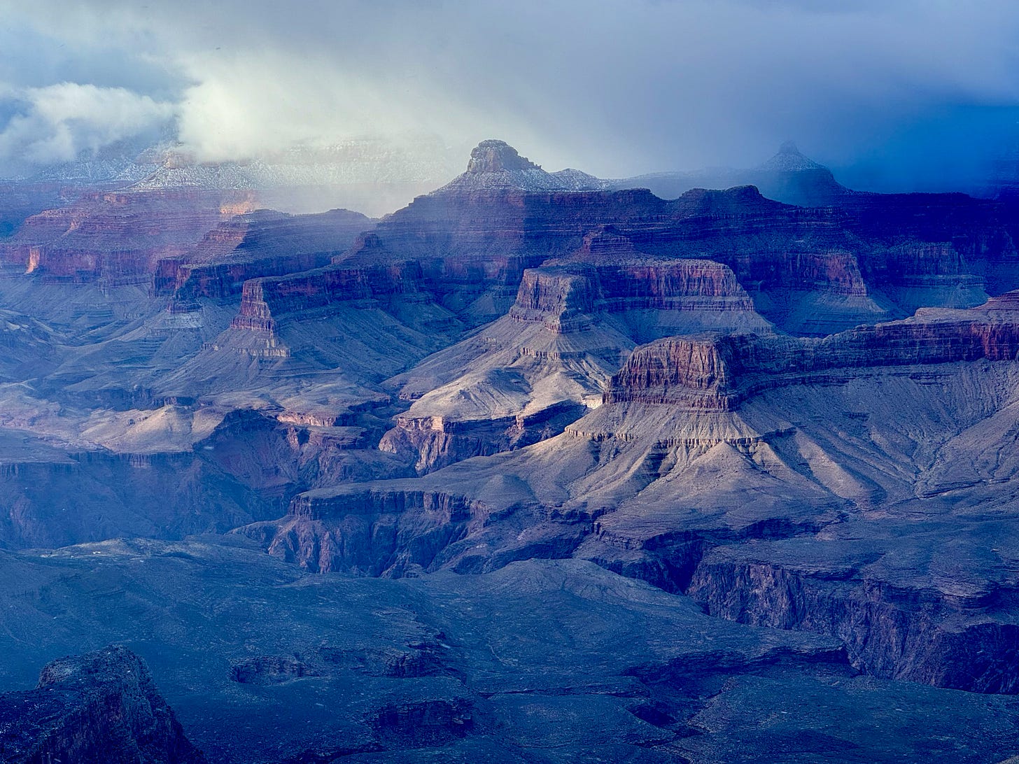 I make it to the distant edge and sit on a rock, grateful for my weight and the additional contact with the ground. The wind picks up and snow begins falling again, the sun’s light shifts, transforming the canyon vistas from red to blue, from clear and precise to soft and distant, to a place that floats between the carved sediments and the steel gray clouds above. I sit breathless at the morphing beauty, taking quick glances at Laura to see how she’s absorbing it all. Stillness turns into bracing against the blustering wind. I secure my hat further on my head and flip my jacket hood up to protect myself from the biting cold. The wind is so strong that it pushes my body forward and back. Be present, I tell myself. Pay attention. Just be here because this is happening right now. The snowfall. The cold. The heavy, looming clouds. I know that being in the Grand Canyon on this precipice isn’t the culmination of anything. It’s also not the beginning. It’s just now. Only now. I’m merely sitting on a trail in a place that was impossible for me to be a year ago.